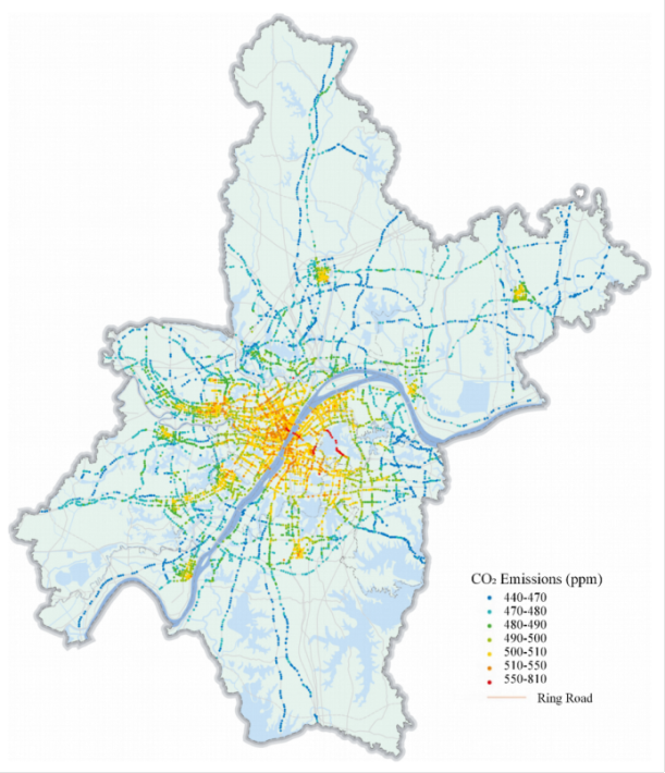 通过车载走航系统实现逐分钟采样,集成CO₂浓度、气象参数(温度、气压、湿度)、经纬度坐标及时间戳,覆盖武汉市九条典型道路场景,形成分钟级时空分辨率的交通碳排放动态监测网络。