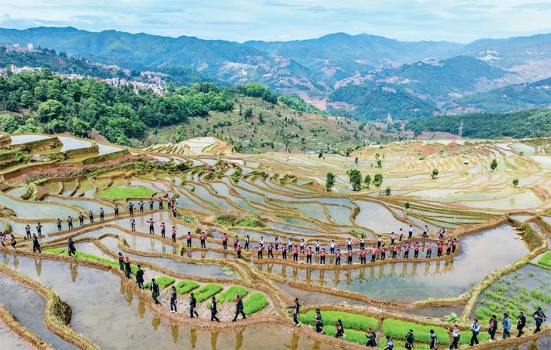为推动自然资源全要素一体化保护修复,各地加强整体谋划山水林田湖草沙等各类自然资源要素空间布局。在云南省,红河哈尼梯田中的水资源在森林、村寨、梯田、水系中循环往复,呈现“四素同构”的农业生态系统。图为2025年5月2日,人们在红河县甲寅村“开秧门”仪式上,沿着梯田踏歌而行(无人机照片)。 新华社记者 胡超/摄