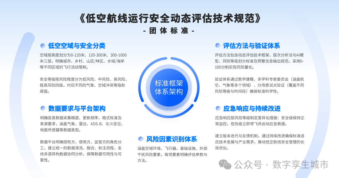 《低空航线运行安全动态评估技术规范》作为国内首个聚焦低空航线安全的团体标准,用来动态预警低空飞行中可能遇到的突发天气、飞行冲突、设备故障等风险,帮助更安全、更高效地开展低空物流、巡检、应急救援等业务。