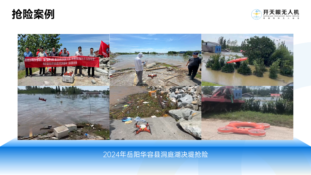 2024年岳阳华容县洞庭湖决堤抢险行动中,智能飞行浮标直接飞抵溃口区域,并迅速完成溃口区流速、水位和水下深度的测量。凭借实时计算断面面积和流量数据的能力,为溃口封堵提供重要的数据支撑。
