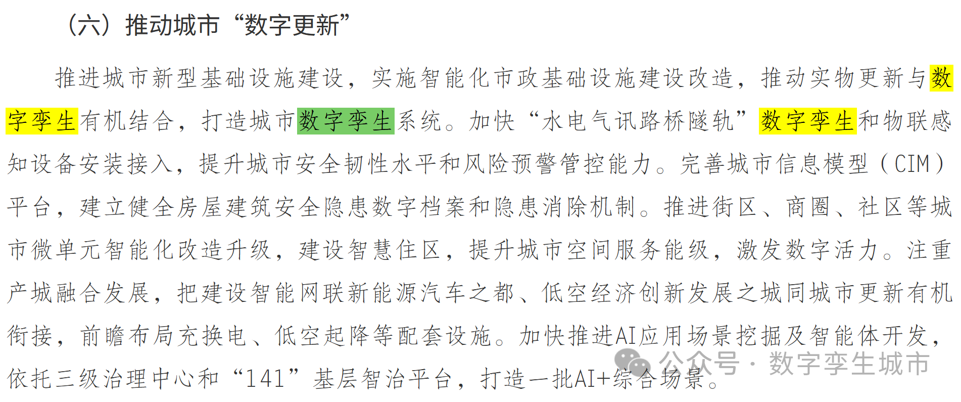 近日,重庆市人民政府办公厅印发《重庆市持续推进城市更新三年行动计划(2025—2027年)》,其中提出,推进城市新型基础设施建设,实施智能化市政基础设施建设改造,推动实物更新与数字孪生有机结合,打造城市数字孪生系统。加快“水电气讯路桥隧轨”数字孪生和物联感知设备安装接入,提升城市安全韧性水平和风险预警管控能力。完善城市信息模型(CIM)平台,建立健全房屋建筑安全隐患数字档案和隐患消除机制。推进街区、商圈、社区等城市微单元智能化改造升级,建设智慧住区,提升城市空间服务能级,激发数字活力。注重产城融合发展,把建设智能网联新能源汽车之都、低空经济创新发展之城同城市更新有机衔接,前瞻布局充换电、低空起降等配套设施。加快推进AI应用场景挖掘及智能体开发,依托三级治理中心和“141”基层智治平台,打造一批AI+综合场景。