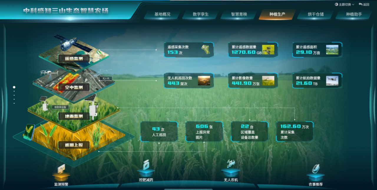 一是构建高质量数据集建设与技术体系。公司构建“空—天—地”一体化的多模态农业数据资源池;部署自主研发的农田智能传感终端,日均处理物联网数据10GB,数据可用率超95%;基于深度学习+多模态建模构建了作物长势分析、生育期识别、病虫草分析、变量处方图等20余种农业智能算法,准确率达80%以上。