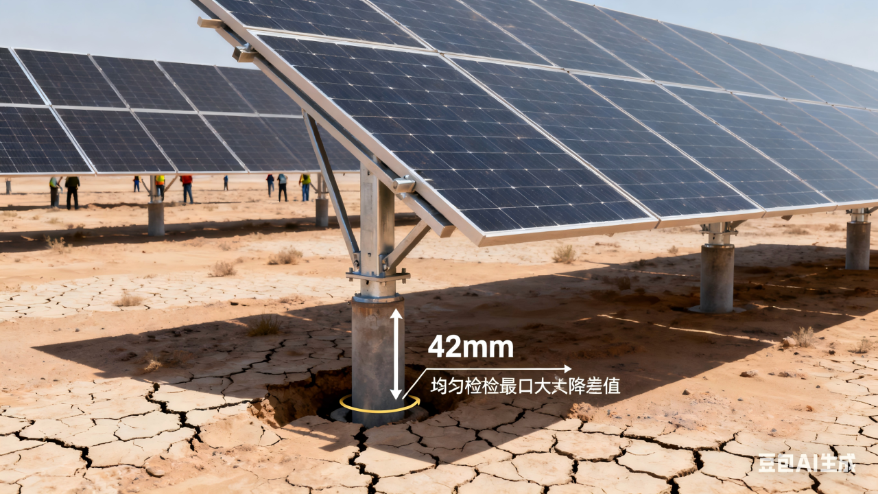 西北荒漠年均降水量不足200mm,地表土层长期失水收缩,极易引发光伏支架桩基不均匀沉降。2025年阿拉善事故中,技术人员实测发现,地基沉降最大差值达42mm,导致支架倾斜角度突破安全阈值1.5°,组件接口受力集中引发隐裂。这种形变具有隐蔽性强、发展缓慢的特点,人工巡检难以察觉早期变化。