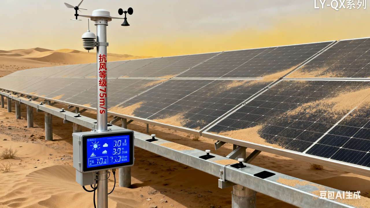 • 风沙冲击监测:在阵列迎风侧部署LY-QX 系列光伏气象站,其抗风等级达75m/s,能实时捕捉风速、风向及风沙流强度数据,同步搭配安装在支架主梁的应变片传感器,监测风沙冲击导致的应力变化。