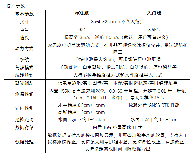 公司依托于自身研发实力以及相关高校科研院所的项目成果转化,目前在自主研发生产和销售的产品有:无人机载单波束侧身系统、单波束测深仪、水下高度计、单波束测量无人船、侧扫声呐无人船、多波束测量系统无人船、ADCP测验无人船、水质监测无人船、深层及表层水样采集无人船、底泥沉积物采样无人船等。