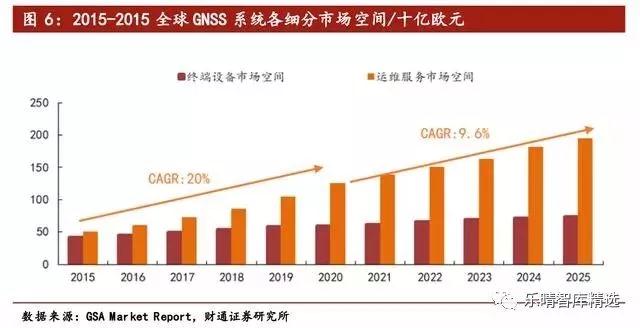 根据《全球导航卫星系统(GNSS)市场报告》的数据显示,下游运维服务的增速在2015-2020年期间将保持每年20%的高增长,2020年后也将保持9.6%的增速。