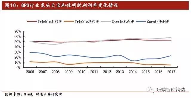 随着 GPS 在民用领域的深入渗透,以天宝和佳明为代表的龙头企业在民用领域布局越来越深;行业集中度逐渐提高给予产业链布局完善的龙头企业(特别是在民 用领域)更高的业务壁垒、更强的盈利能力,因而毛利率也呈现稳步上行的态势。