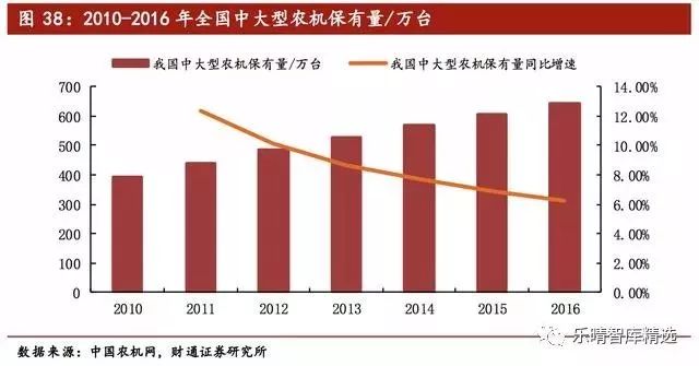 据中商产业研究院统计,2017年我国大中型农机占农机保有量总数的71%,则为607万台,若按照2010-2017年的CAGR约6.44%进行估算,则2020年我国大中型农机保有量将达到899万台。