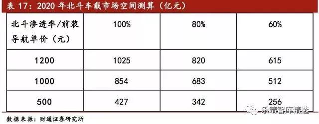 基于此,我们估算,假设2020年北斗渗透率能够分别达到60%/80%/100%的水平,则其市场将拥有5124/6832/8540万台网联汽车需进行北斗系统的配备,若GPS前装导航设备单价分别以500元/套,1000元/套及1200元/套进行测算,则市场空间将分别达到256/342/427,512/683/854,615/820/1025亿元。