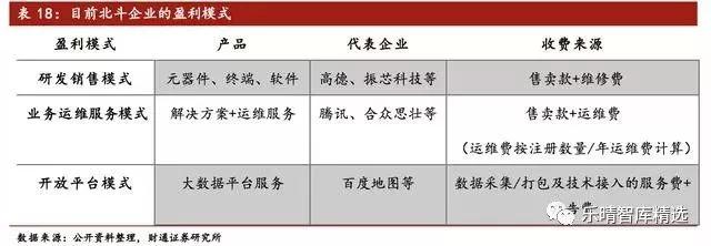 产业链不断成熟,新型盈利模式逐渐显现。随着北斗信息平台正在日渐完善,基于大数据的服务模式有 望成就新商业模式。当前,在位置服务领域,企业主要有三种盈利模式: