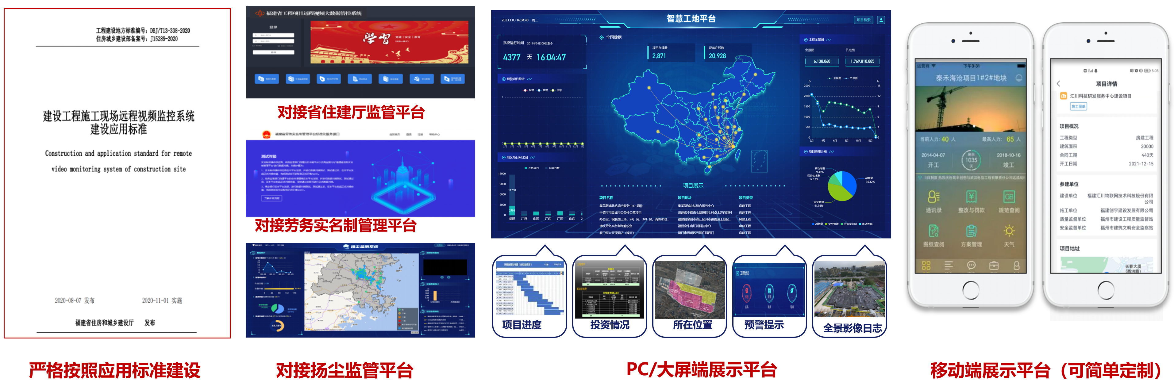 智慧工地平台已通过国标GB/T 28181-2016、GB/T 35114-2017全项认证,网络安全通过国家网络安全等级保护2.0认证,获得CMIMI3认证,支持SM9国密算法:具备高并发、兼容性、稳定性、扩展性、安全性等优势,支持符合国标协议的视频监控设备与平台的接入与管理,支持百万级并发请求能力,可满足高效、透明、集约、量化的监督管理要求。云平台施工大数据驾驶舱智能BI可展示企业、项目概况,异常告警情况等。BI大屏可以根据行业特性、管理需求等个性化需求,采用数据、图表、GIS等方式进行定制化展示。