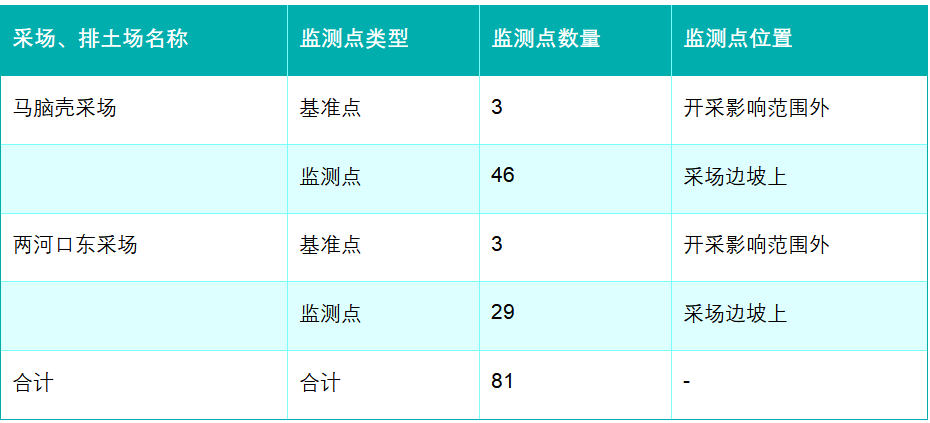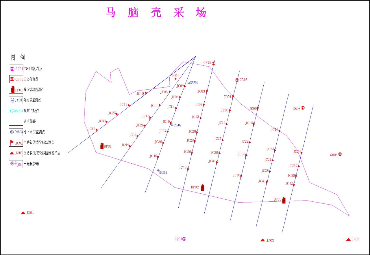 马脑壳采场边坡布设 46 个监测点,搭配 3 个外围基准点;