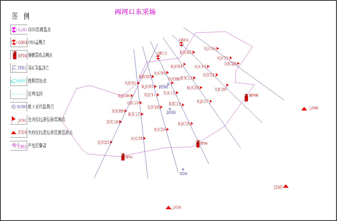 两河口东采场边坡布设 29 个监测点,搭配 3 个外围基准点;