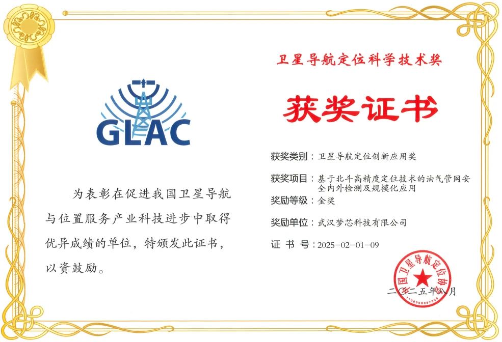 由梦芯科技和国家管网集团共同申报的《基于北斗高精度定位技术的油气管网安全内外检测及规模化应用》项目,获评中国卫星导航定位协会2025年度卫星导航定位创新应用奖“金奖”。