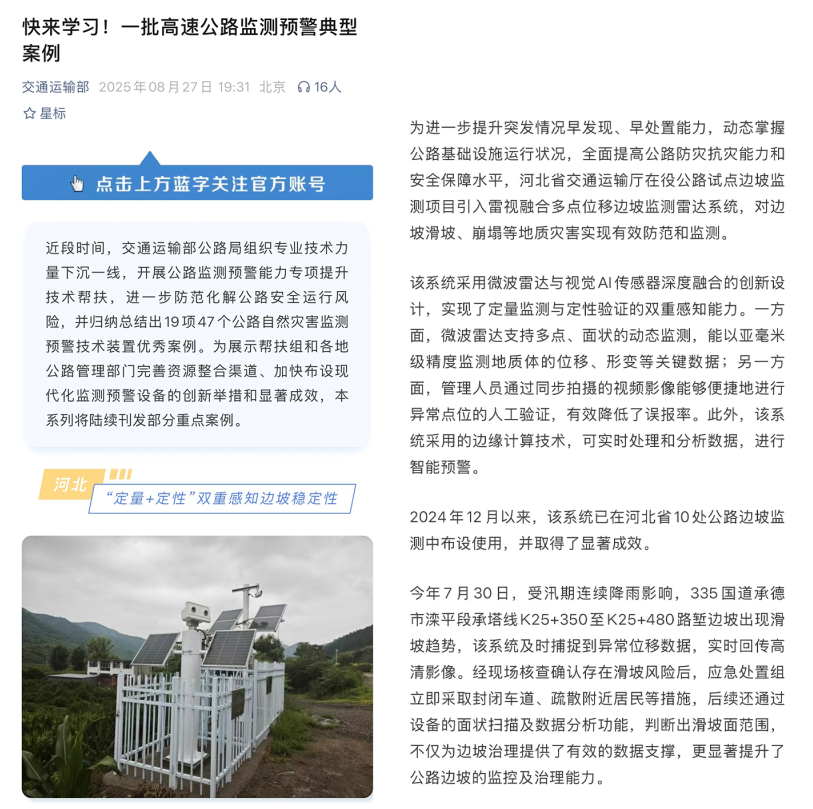 2024年12月以来,该系统已在河北省10处公路边坡监测中布设使用,并取得了显著成效。