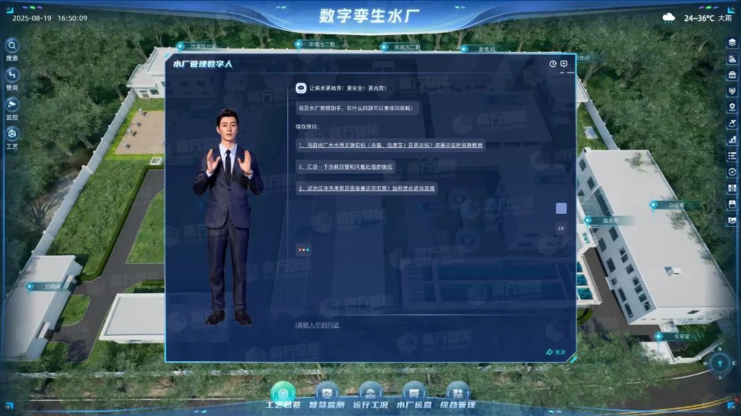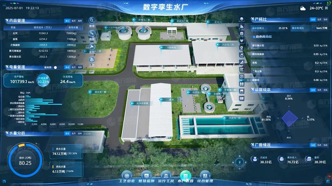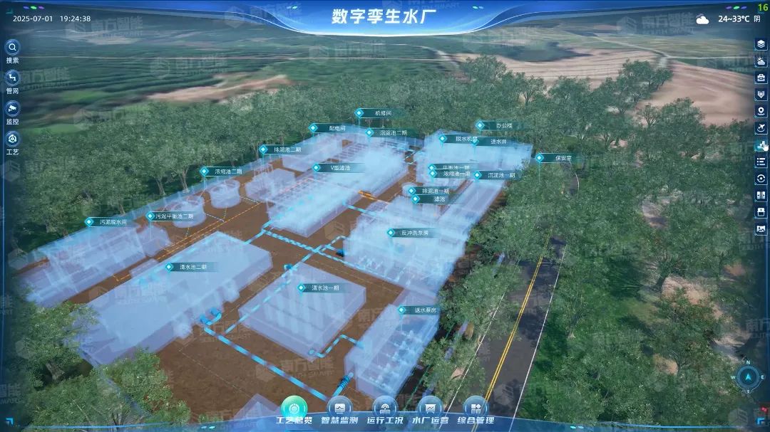 南方测绘集团旗下南方智能推出数字孪生水厂综合解决方案。方案融合物联网、数字孪生、AI 等技术, 1:1复刻真实水厂,实现设计工艺全流程数字化,无缝衔接生产信息。同时,结合智能算法完成水处理全流程虚拟仿真,在虚实融合中反哺现实,通过智能分析与协同控制,实现水厂全要素数字化、状态可视化,打造虚实交融、智慧管理的新型运营模式。