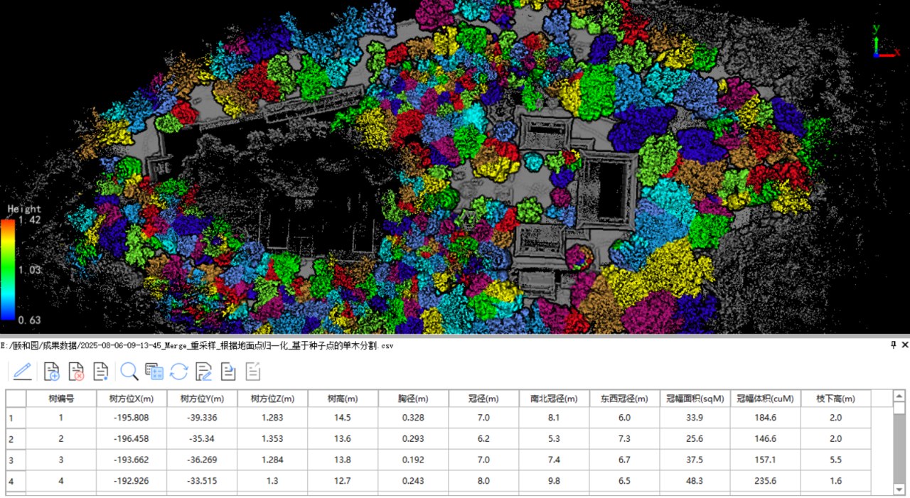 依托强大的LiDAR360后处理软件,海量点云数据被快速进行去噪、分类,精准分割出每棵树的 “身份证信息” 和三维形态都清清楚楚。