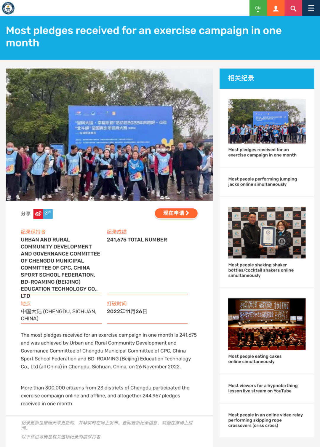 吉尼斯世界纪录官网公布本项纪录结果,纪录保持者为中共成都市委社治委、全国体育运动学校联合会、北斗遨翔公司