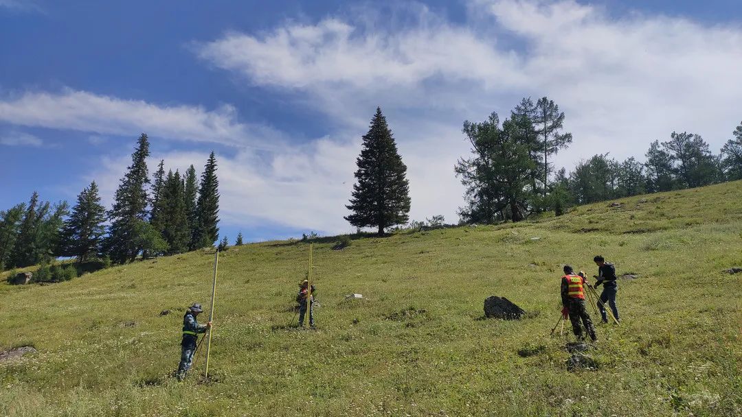 队员们在新疆阿尔泰山脚下的高山草甸进行水准测量。杨斌斌 摄