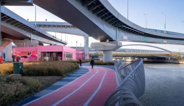 苏州河中环立交桥下火龙果色健身人行步道。