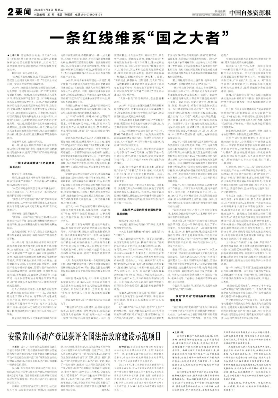 云南省禄丰市彩云镇水稻丰收。张海清 摄这一年,持续以“零容忍”态度坚决遏制新增乱占耕地建房问题。地方主动处置违反农村乱占耕地建房“八不准”问题7497宗,自然资源部公开通报典型案例74宗,坚持早发现、早制止、早查处。“政贵有恒,治须有常”。2022年,“牢牢守住18亿亩耕地红线”出现在党的二十大报告里,“确保中国人的饭碗牢牢端在自己手中”在中国式现代化进程中的分量越来越重。严守耕地红线,“严”字值千钧。因为,我们守的是国家和民族的生命线,是发展与安全的兜底线,也是应对风险挑战的基本线。未来征程,始终需要把握“最严格”的主基调,当好18亿亩耕地红线的坚定守护者、高质量发展的有力推动者、人与自然和谐共生的坚决促进者。