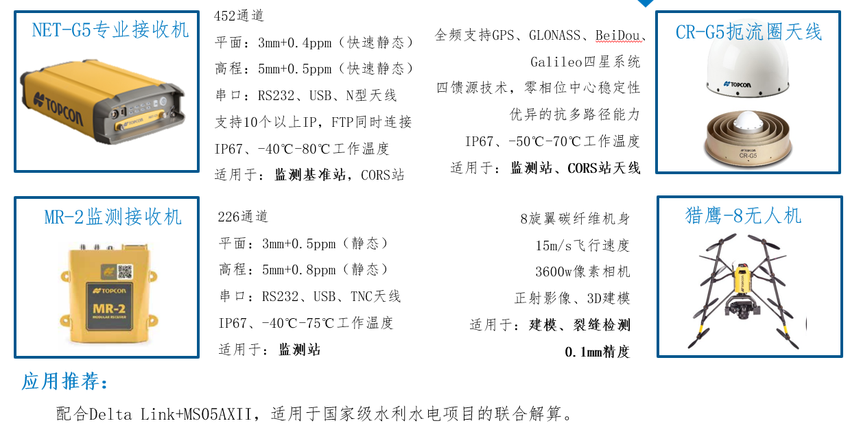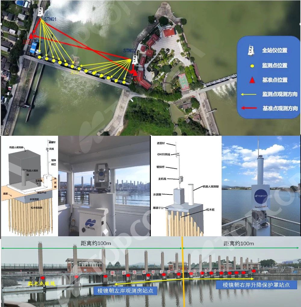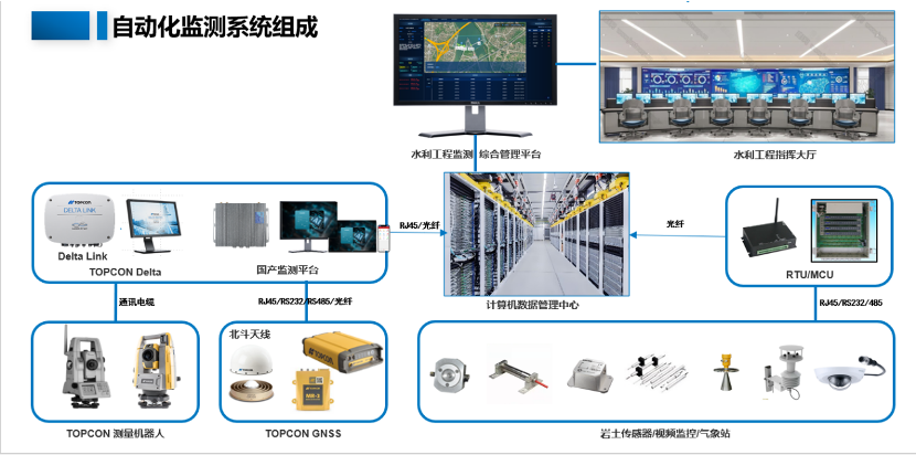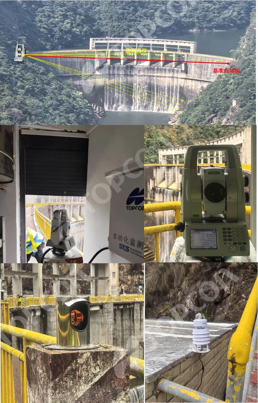 拓普康积极参与国内水利安全监测设施建设,携手国内集成商,提供软硬件一体化综合解决方案。包括自动全站仪(MS05AXII/GT-1201)、高精度电子水准仪(DL501)、GNSS接收机(NET-G5\MR-2)、自动化监测平台软件、全站仪控制终端、气象站、内观传感器、视频监控、自动推窗观测房、升降防护罩、自动卷帘等。支持本地化部署,支持4G、5G、RJ45、RS232/RS485、光纤通讯方式,支持单站、多站组网观测。