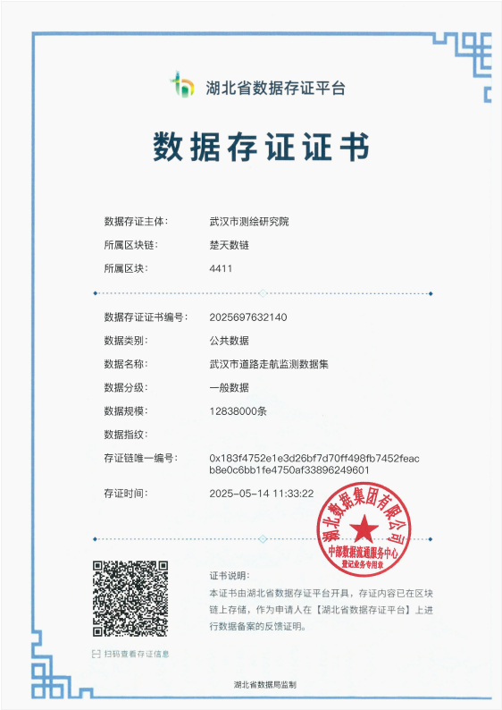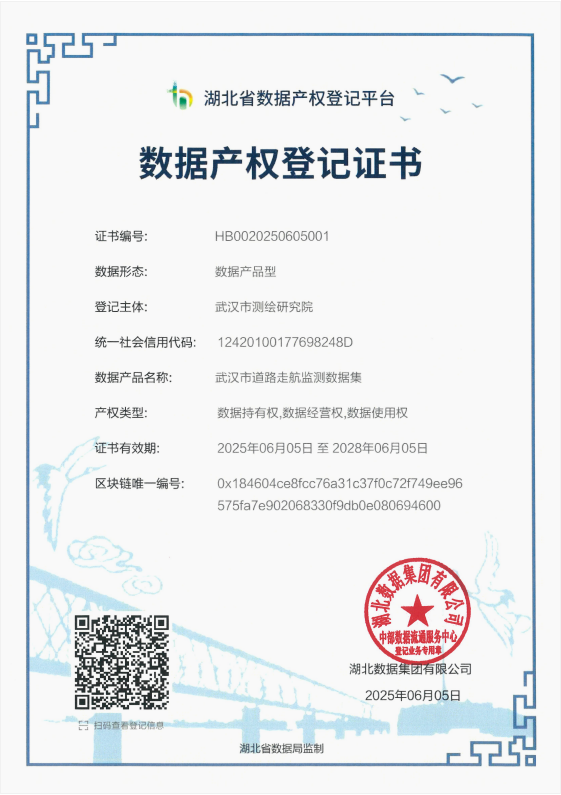 近日,武汉市测绘研究院在湖北大数据集团“中部数据流通服务中心”(以下简称“中部中心”)的助力下,深入挖掘测绘地理信息数据要素价值,推动测绘地理信息数据资源化、资产化和社会化应用,率先在测绘领域实现全省首个事业单位数据资源“三确”工作,并获得由中部中心颁发的数据存证证书、数据产权登记证书。