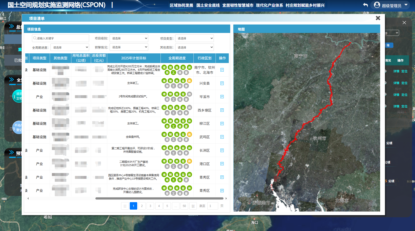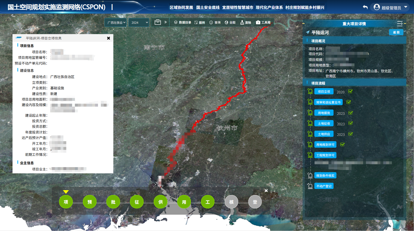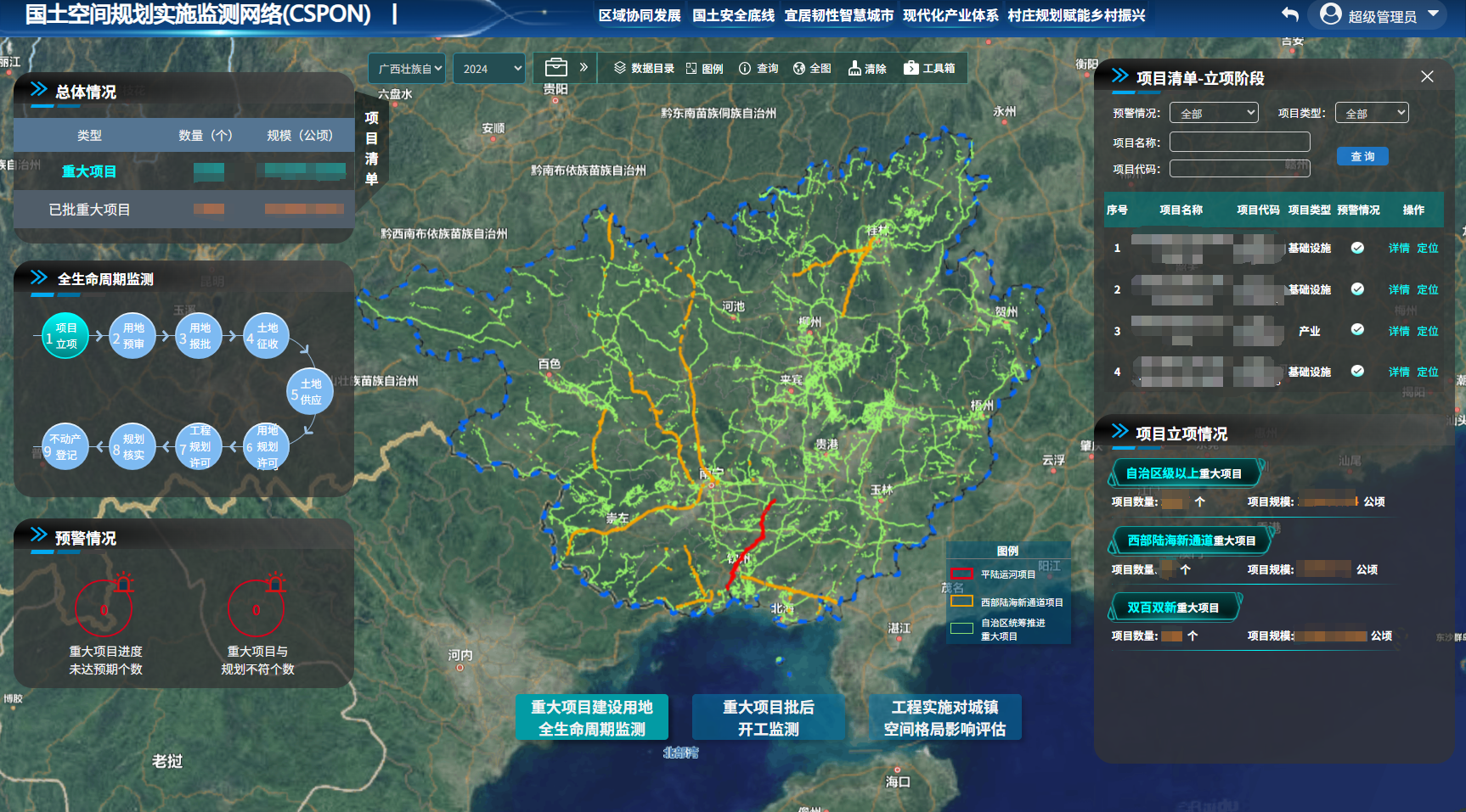按照自然资源部关于开展国土空间规划实施监测网络(CSPON)建设试点的安排部署,广西结合自身实际,聚焦西部陆海新通道重大战略实施,按照“1个平台、1条主线、3大任务、N个工具”总体思路,探索构建重大项目全生命周期实施监测预警应用场景。