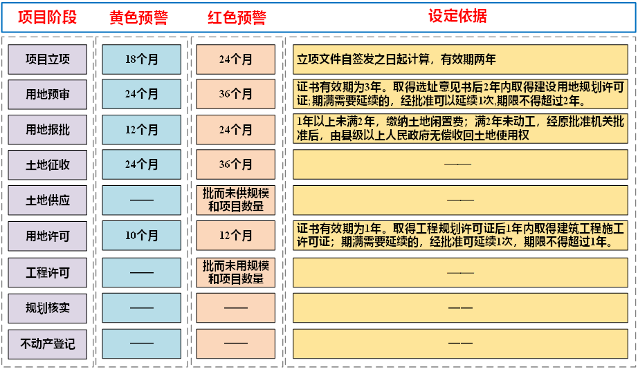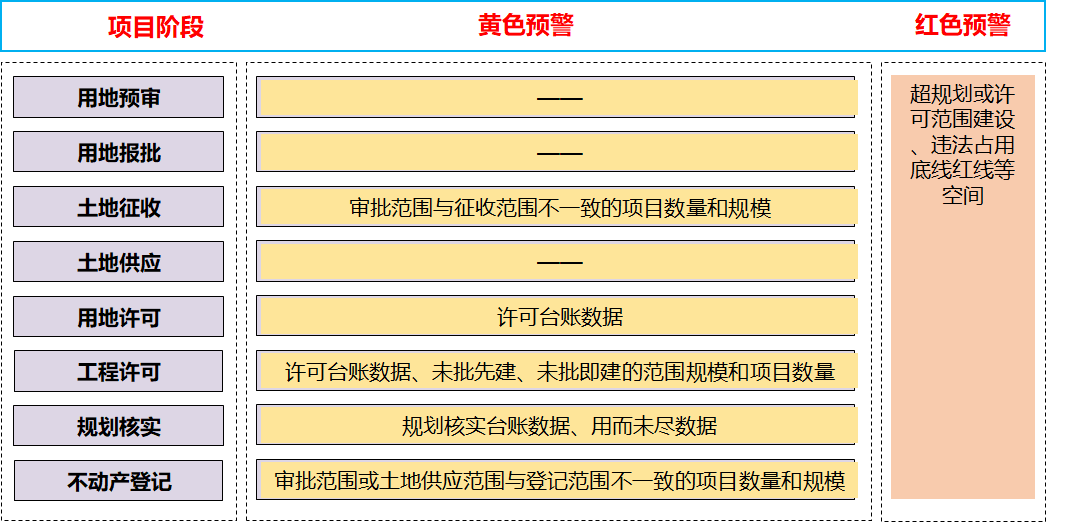 分级预警,构建阶梯预警体系。为加强对九大环节的监管,实现精准服务,提高审批效率,搭建差异化、阶梯式的预警功能模块,在时间维度上,结合各个环节证书文件有效期合理设置黄色提醒和红色预警;在空间维度上,对比分析前后环节项目范围,对范围不一致的区域进行识别并分情形提示和预警。