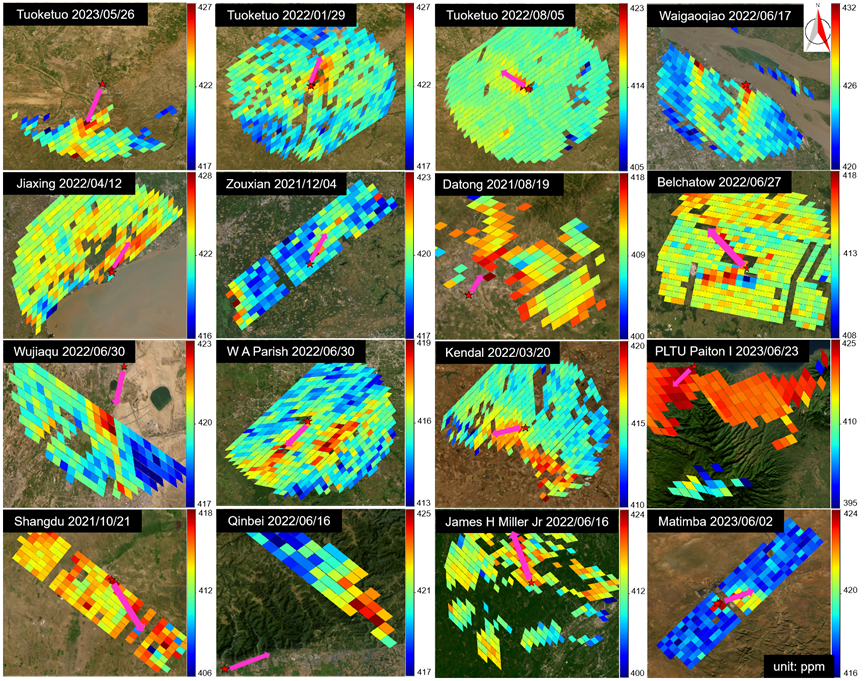 针对上述问题,该研究团队基于美国轨道碳观测卫星3 号(OCO-3),创新提出“两段线性回归融合高斯函数拟合”模式优化算法,大幅提升碳排放背景值识别效率;运用曼惠特尼秩和检验,开发动态风向校正算法,增强烟羽轨迹反演精准度;构建基于大气稳定性分级响应机制的烟羽抬升模型,精确刻画烟气动态抬升过程,首次实现大型燃煤电厂二氧化碳排放的高精度动态量化与制图。