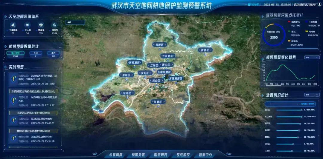 凭借卫星遥感影像数据、铁塔视频摄像头、无人机和智能识别等最新技术手段,武汉已构建卫星遥感“天上看”、无人机“辅助查”、视频监控“实时看”和网格员“地上巡”的“天空地网”一体化监测体系。耕地保护工作实现从“被动整改”到“主动发现”,再到“源头管控”的转变。