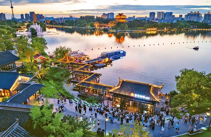消费是经济增长的重要引擎,大力提振消费是应对外部环境变化、畅通国内大循环、提升居民生活品质的关键。在江苏省城市足球联赛泰州队主场比赛期间,泰州推出跟着“苏超”逛泰州活动,借赛事东风,促文旅消费。图为2025年6月28日,游人在泰州市海陵区桃园景区游玩。 新华社发 汤德宏/摄