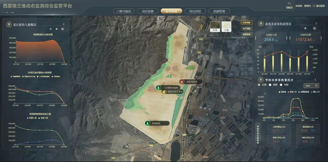 构建基于GIS的三维可视化动态监测综合监管平台,实现文物保护数据动态监测、总体格局、遗址本体数据周期性监测、日常巡检,遗产区环境、游客等监测数据的展示、分析,把监管结果实时、直观地呈现给西夏陵遗产保护各级管理用户,辅助西夏陵遗产区管理、监测评估、风险发展趋势预测等决策。