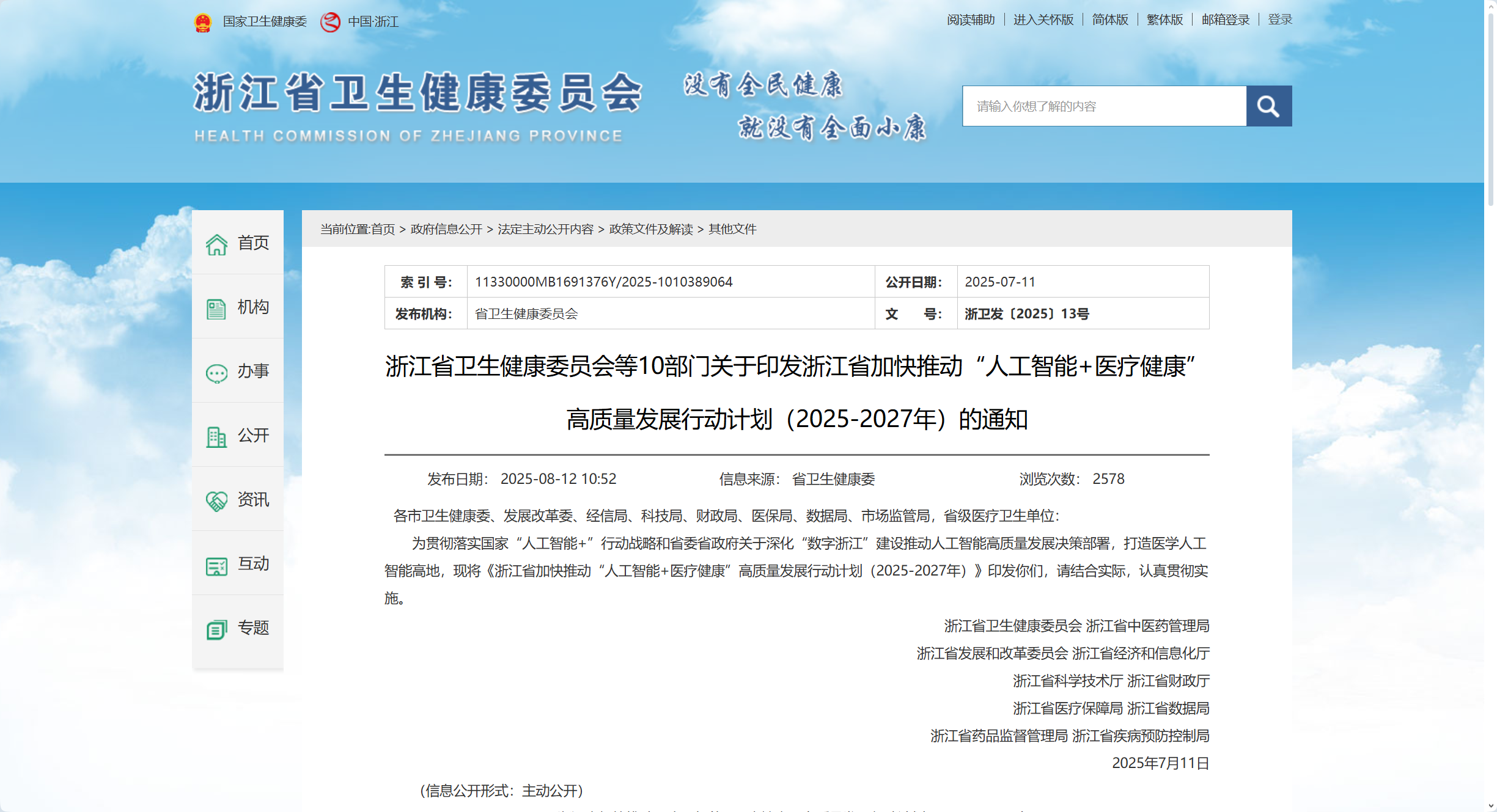浙江省卫生健康委员会等10部门印发了《浙江省加快推动“人工智能+医疗健康”高质量发展行动计划(2025—2027年)》(以下简称《行动计划》),其中提到,以高标准建设国家级人工智能医疗行业应用基地为引领,立足浙江、辐射全国,坚持政府主导、多方参与、集约统筹、安全可控发展原则,推动人工智能全面赋能卫生健康事业和生命健康产业,打造“人工智能+医疗健康”中试验证、行业应用和产业生态高地。