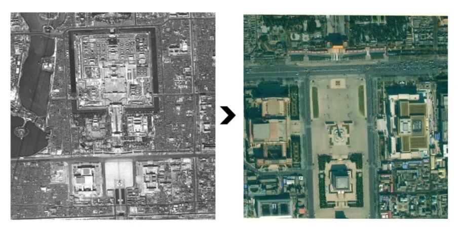 右:现代卫星彩色数字图像(2012年天安门)