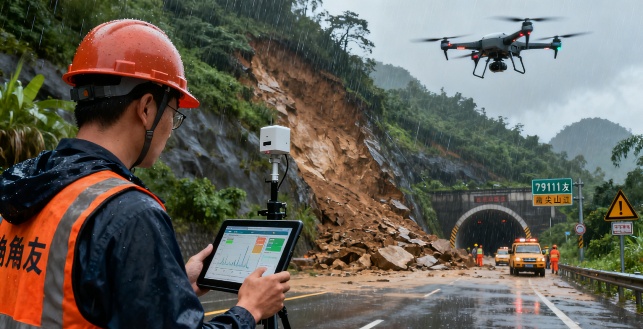 2025年10月8日16时许,受台风“博罗依”“麦德姆”叠加影响,广西凭祥市持续强降雨引发G7211南友高速六尖山隧道出口突发山体滑坡,双向车道被完全阻断。与传统险情处置不同的是,此次救援并未陷入“盲人摸象”的困境——部署在隧道周边的12组倾角传感器早已提前48小时发出预警,数据显示山体边坡位移速率从日均0.3毫米激增至 2.1毫米,为交通管制预留了关键时间窗口。