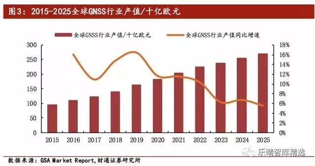 在终端需求及下游运维服务不断渗透的基础上,全球GNSS产值也将由2015年948亿欧元提升至2025年2681亿欧元,CAGR达10.96%,呈现出稳定增长态势。