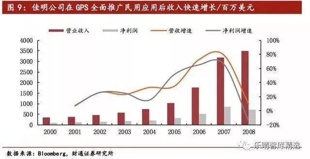 美国GPS民用消费终端领军企业佳明公司也展现了类似的特征,2000-2008年是该公司收入爆发式增长的阶段,营收由3.5亿美元增长到34.9亿美元,年复合增长率达到33.5%。