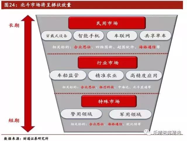 目前,北斗系统的主要应用市场分为特殊市场、行业市场及民用市场。若按时间轴来划分,我们认为北斗的落地顺序将按照梯型的顺位依次放量。