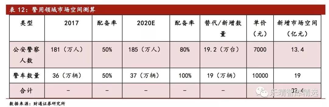 在此基础上,我们认为在2018-2020年期间将仍有19万辆警车需进行北斗系统的替换及新增,若按照北斗警务车载终端的市场平均价10000元来计算,到2020年其市场规模将升至37亿,增量空间约为19亿。