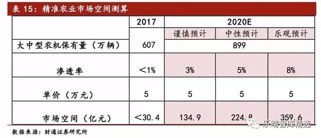 所以在此基础上预测,若北斗渗透率在2020年分别达到3%/5%/8%,则其市场将拥有26.97/44.95/71.92万台农机需进行自动驾驶系统的更新换代,若按5万元/套进行估算,则其市场空间将达134.9/224.8/359.6亿元。