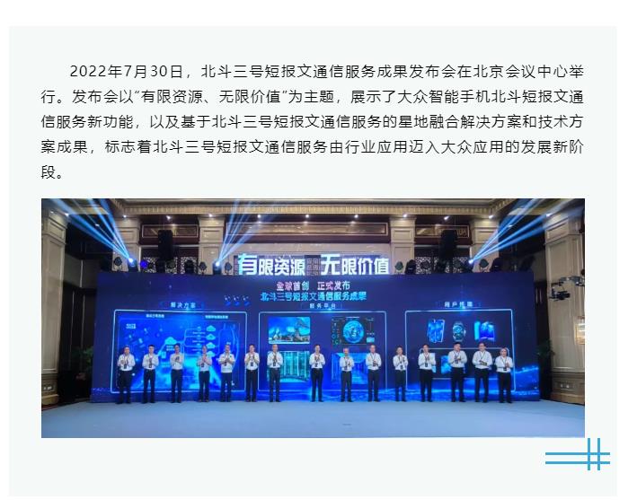短报文通信是北斗系统区别于其他全球卫星导航系统独有的特色服务之一。北斗三号短报文通信服务覆盖中国及周边国家和地区,具备低成本、广覆盖、高可靠和随遇接入等特点,可对地面移动通信网络进行有效补充,以满足我国经济社会在无地面网络覆盖地区应急通信、搜索救援等服务需要。作为国家应急体系的重要组成部分,近年来短报文通信服务已经在民生保障、救灾减灾、野外搜救等方面发挥了积极作用。目前,北斗三号短报文通信服务平台完成建设,为实现短报文通信服务高效、安全、规范管理提供了有力支撑,使短报文通信服务能力和水平得到质的提升,短报文通信应用和相关产业发展迎来了前所未有的历史机遇。此次北斗三号短报文通信服务成果发布会,由中央网络安全和信息化委员会办公室、国务院国有资产监督管理委员会、中国卫星导航系统管理办公室、中国卫星导航定位应用管理中心指导,中国兵器工业集团有限公司、中国移动通信集团有限公司主办。