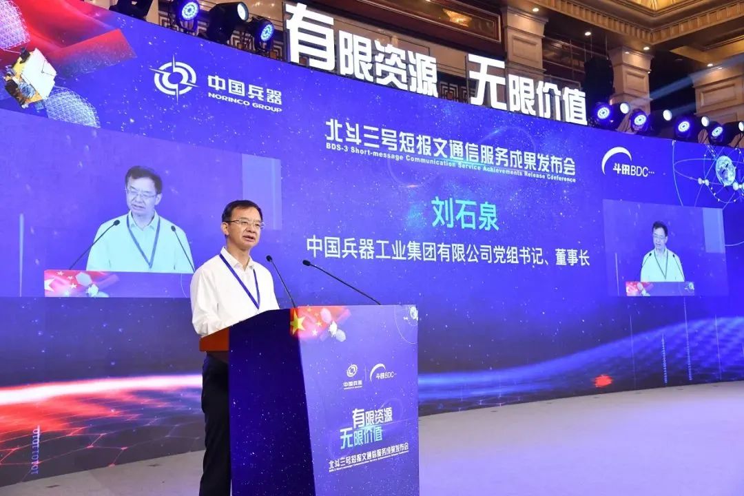 刘石泉董事长在致辞中表示,兵器工业集团坚决贯彻落实习近平总书记关于北斗建设发展系列重要指示批示精神和党中央决策部署,在支撑国家北斗应用产业发展战略谋划、推动构建国家北斗应用产业体系等方面主动作为。兵器工业集团作为北斗三号短报文通信服务平台的建设和运营主体,联合兄弟央企和相关单位,创新体制设计、攻克关键技术,全球首创实现了北斗三号短报文通信服务融入大众智能手机。兵器工业集团将以此次成果发布为契机,担当“国家队”、当好“排头兵”,进一步带动北斗特色服务面向大众应用,有力提升北斗品牌价值和影响力。一是固平台、促融合,提升平台稳定运行和服务运营能力,推动北斗三号短报文通信与物联网、区块链等新兴技术交叉创新,融网络、融数据、融终端、融应用、融服务,走进新基建,催生新业态,助力建设“一流的北斗”;二是强基础、补短板,加快突破关键技术,提供亚太地区手机用户全天时全天候全覆盖服务能力,提高国产化、高端化能力,提升产业链供应链现代化水平,更好建设“中国的北斗”;三是建体系、拓应用,围绕服务国家重大战略需求、经济社会发展和人民生命安全需求,支撑构建北斗三号短报文通信业务监管体系和运营服务体系,加快推进北斗短报文通信高质量发展;以“一带一路”建设为重点,加快北斗短报文通信服务“走出去”,加快推进北斗商业化国际化应用服务。