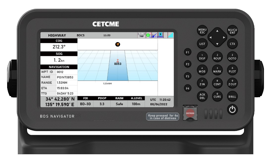 该设备不仅支持单北斗定位,同时可扩展为北斗、GPS、GLONASS、Galileo等多系统联合定位;能够实时跟踪与显示卫星导航状态,提供自主完好性监测。具备船舶导航一般功能,如定位、航速、航向等信息的显示;航线与标记的设计,落水信标(MOB),航迹存储与显示;航程、航速、抵达/锚位、航差等提醒功能;提供标绘、卫星状态、航向、航路、数据等多种显示模式。具备船桥报警功能,如水平分量精度因子(HDOP)超限、差分信号丢失、位置丢失、完好性状态等。通过外部接口能提供差分定位与北斗三号区域短报文服务。同时也符合IEC 62923、IEC 61162、IEC 62288等标准的要求。总体上,该设备满足国际海事组织新规则以及船舶GNSS导航仪在国际航行应用中的相关功能、接口需求。