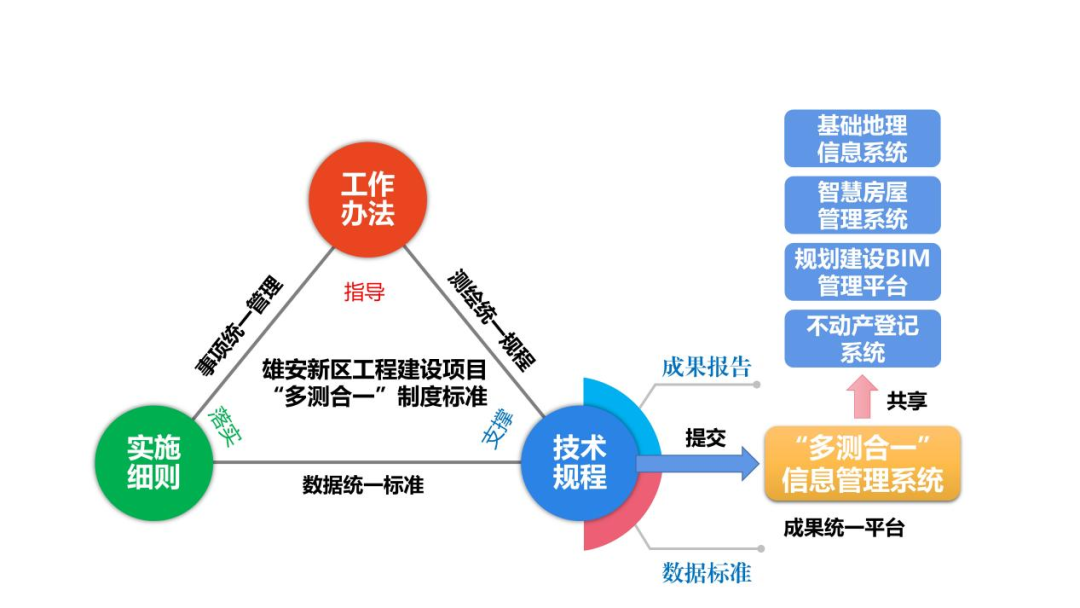 雄安新区“多测合一”信息管理系统是将制度、标准落地实施的重要信息化抓手。系统建设一年多来,基于工作流引擎、地理信息系统等最新技术架构,实现了“测绘服务事项统一管理、测绘成果统一格式、测绘数据统一标准、成果共享统一平台”的全过程管理服务新模式,提高了测绘作业效率,降低了建设单位和测绘作业单位的办事难度,加强了行政主管部门对“多测合一”市场的监管。系统紧密对接新区政务服务网、块数据平台、BIM管理平台、基础地理信息系统以及不动产登记、智慧房屋管理等相关业务系统,有力支撑了新区工程建设项目竣工验收、回迁安置、摇号分房、不动产登记等工作,促进了容东、容西、雄东、启动区等片区的住宅和配套设施等测绘成果在部门间的互认共享和深化应用。