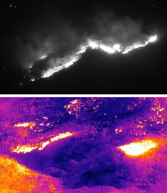 无人机具备热成像镜头,特别是对于浓烟环境下,热成像可以穿透浓烟环境,火线及现场人员位置一目了然。
