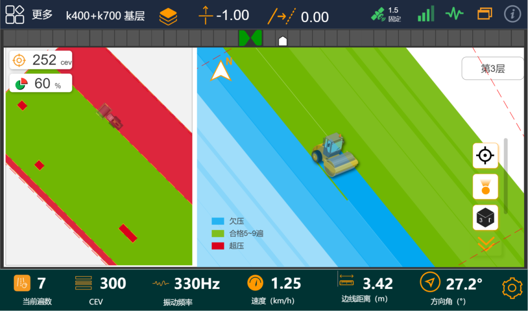 机械一边施工,平板一边实时图形化展示碾压施工过程,用不同颜色来区分压实遍数,还能随时查看机械位置、方向、速度、VCV值、压实遍数等。