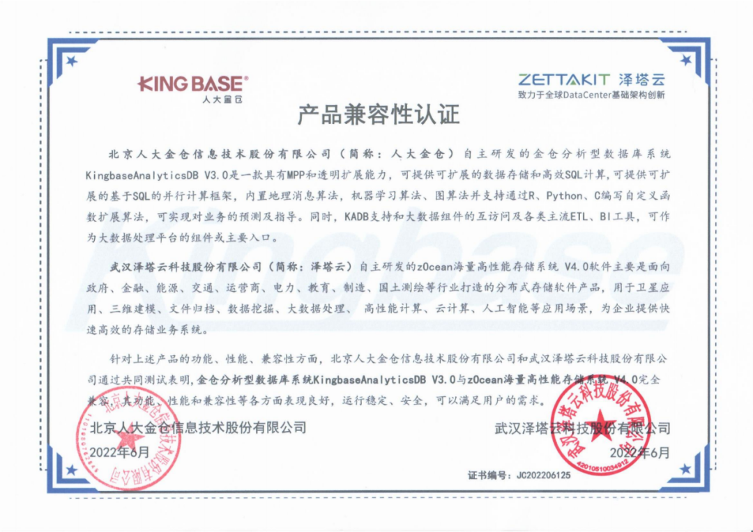 本次适配采用了人大金仓自主研发,具有MPP和透明扩展能力、可提供可扩展的数据存储和高效SQL计算的金仓分析型数据库系统KingbaseAnalyticsDB V3.0与泽塔云自主研发的zOcean海量高性能存储系统V4.0软件系统。经测试,双方在功能性、易用性、可扩展性、信息安全性等方面均有出色表现,两款产品完全兼容适配,运行流畅,性能卓越,可以给用户带来更好的使用体验。