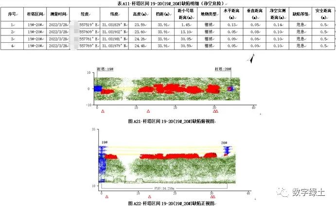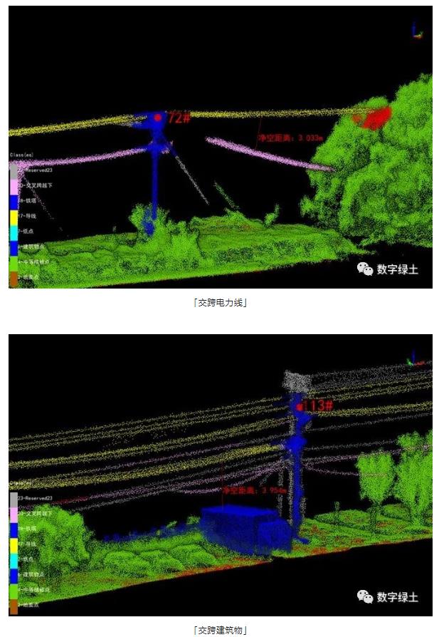 LiPowerline对配网线路进行自动分类后,即可进行净空危险点分析,能够快速分析配网线路下方的树木、建筑物、交跨物与导线的净空距离。