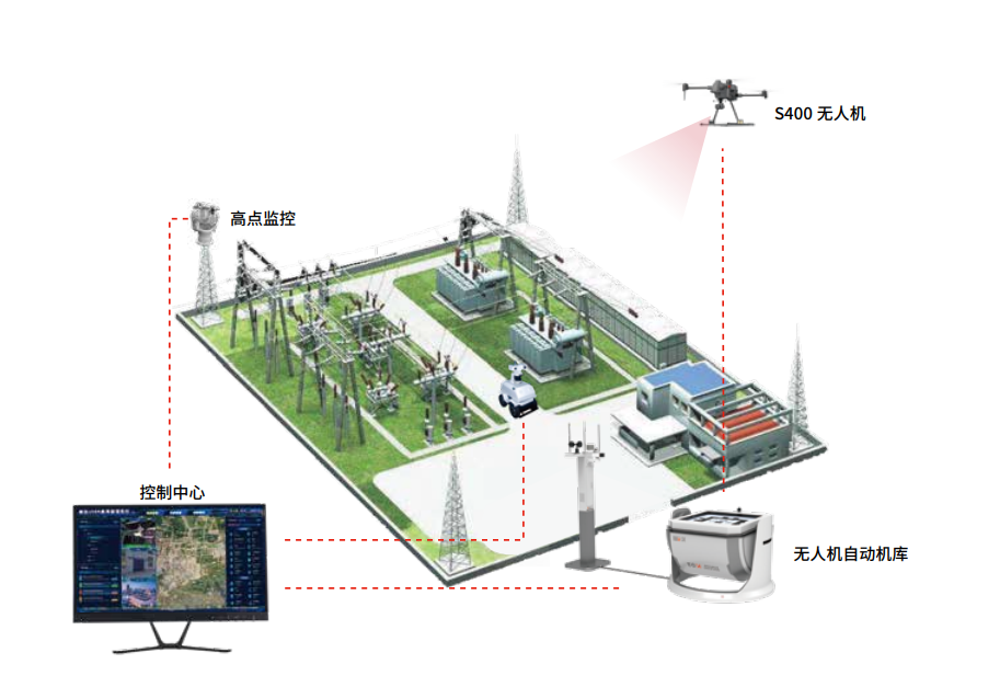 S400无人机结合K01无人机自动机库配合使用,进一步实现电力巡检无人化作业,真正做到一键巡检作业、一键数据回传,将巡检全流程的操作进行深度简化。